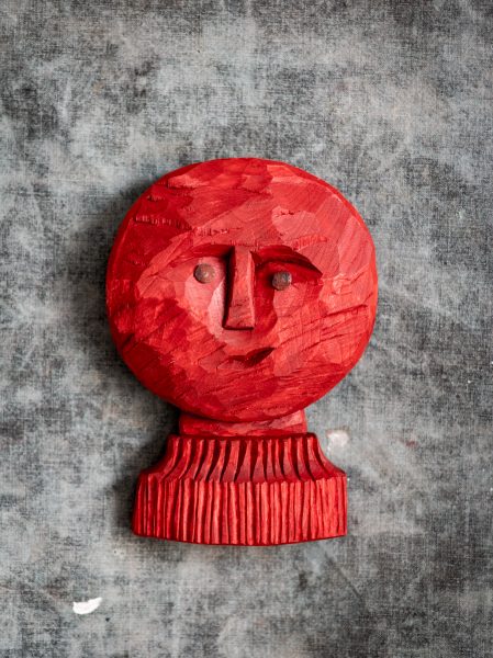Vägghängd skulptur ”De levande” ca 20 x 15 cm. Asp, smidd spik, oljefärg.