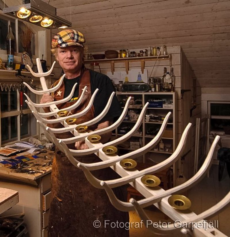 Som pråmar ska de stäva genom det vatten som flyter i vuxenlivets vedermödor och ge förtröstan och tillit till en ung betraktare. De tre ljusbärarna är inspirerade av votivskeppen som ofta hänger i bönekapell efter norrlandskusten. De blir kontaktskapande metaforer med andra världar. materialet i ljusbärarna är krokvuxen björk från Klimpfjäll, (Tack Gunnar och Eva). Jag tog ett trettiotal ämnen med rätt böj för att uppnå största möjliga styrka i spanten. Ljushållarna är specialgjorda för ändamålet och tilvverkade av trycksvarvad mässing. De ska monteras i mars 2011. Den fina bilden är tagen av Peter Garpefjäll, Umeå.