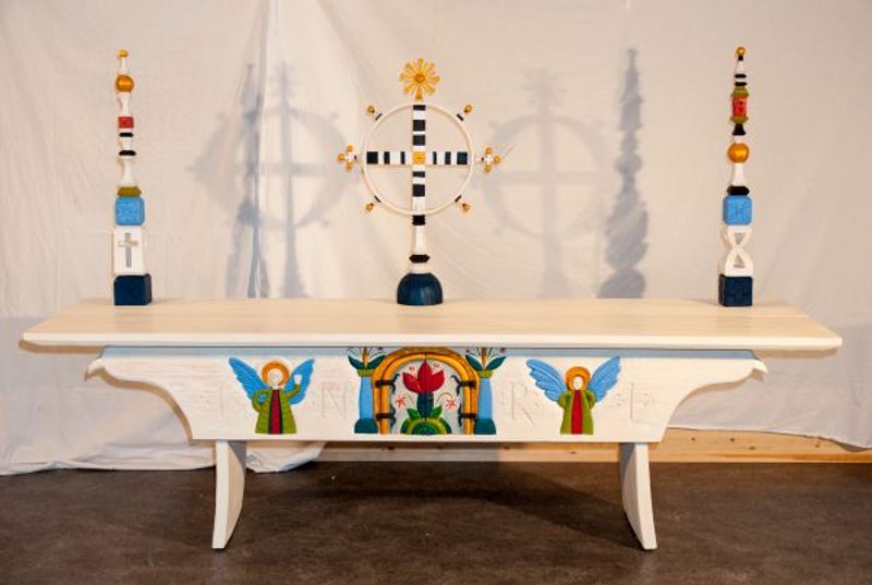 Altaret är inspirerat av ett norskt kistebord från 1400-talet som har ett utrymme för förvaring under bordskivan. I original med drakhuvuden, men den fornnordiska estetiken gjorde kyrkan upp med redan på tusentalet så det kändes inte aktuellt att försöka återinföra den 2010. Den tunga konstruktionen med ingradade benbrädor och intappade sidostycken blev en bra motvikt till den enorma lokalen med ljusinsläpp under det 10 meter höga taket och med gradänger i kortänden att sitta på. Eftersom den skulle vara flyttbar, mobil, försågs den med små rullhjul under de breda benbrädorna för att tas fram vid gudstjänst.