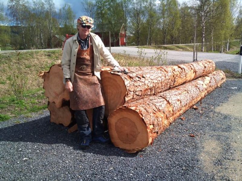 Grannen Melker Eriksson kom med traktorn och körde fram storfetfurorna till arbetsplanen utanför bagarstugan. Min eminenta assistent slöjdaren och konstnären Stefan Markström var taggad och praktikanten Elisabeth förundrad över stockstorleken.